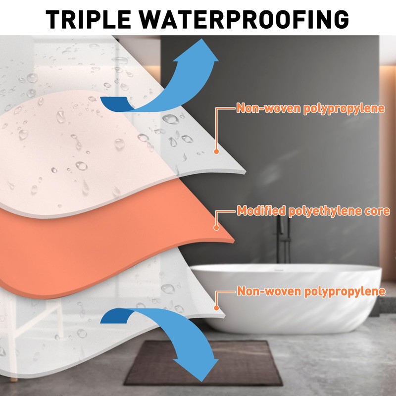 - 【Highly Waterproof and Moistureproof】This 20-mil (0.51 mm) thick waterproof tile underlayment, with a modified polyethylene core and continuous filament fiber exterior, preventing cracks and avoiding dampness and mold. Additionally, it serves as a vapor retarder with low water vapor permeance, making it ideal for steam rooms and other high-humidity environments.
