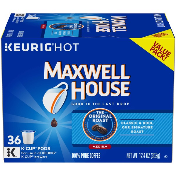 Maxwell House Original Roast Ground Coffee K Cups have a consistent signature taste that is good to the last drop. This rich medium roast coffee is exceptionally smooth and is the perfect start to your day. Made with 100 percent pure coffee beans, this gourmet roast is great served black or with cream and sugar. Brew a single cup of this balanced ground coffee in any Keurig brewing system for a classic cup of medium coffee anytime you want. This Maxwell House Coffee is packaged in individual K Cups for single-serve cups every morning. This 12.4 ounce box contains 36 K Cups. From breakfast blend to French roast, Maxwell Houses signature taste is created through a process that isn't done the easy way, but the right way, for 125 years. Good to the last drop. Keurig, K-Cup, K Cup, and the K logo are trademarks of Keurig Green Mountain, Inc., used with permission. For use with Keurig K-Cup Brewers.