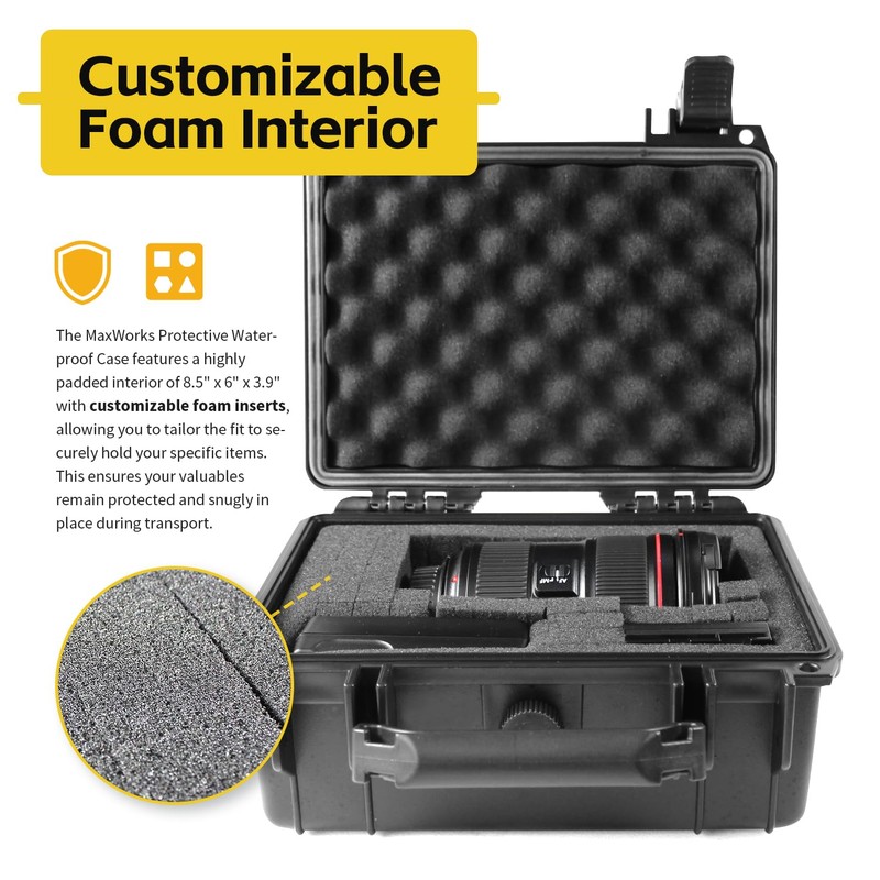 - [Customizable Foam Interior]: The MaxWorks Protective Waterproof Case features a highly padded interior of 8.5" x 6" x 3.9" with customizable foam inserts, allowing you to tailor the fit to securely hold your specific items. This ensures your valuables remain protected and snugly in place during transport. All encased in an exterior of 9.1" x 7.6" x 4.4".