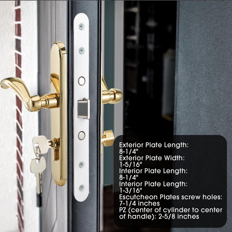 This storm door handle accessory set provides security and convenience for your storm door, featuring a clean and elegant appearance with matching internal and external finishes that require no painting. Size specifications: total panel length: PZ (center of lock cylinder to center of handle): 2-1/2", decorative plate length x width: 8-1/4" x 1-3/16", decorative plate screw spacing: 7-1/4".