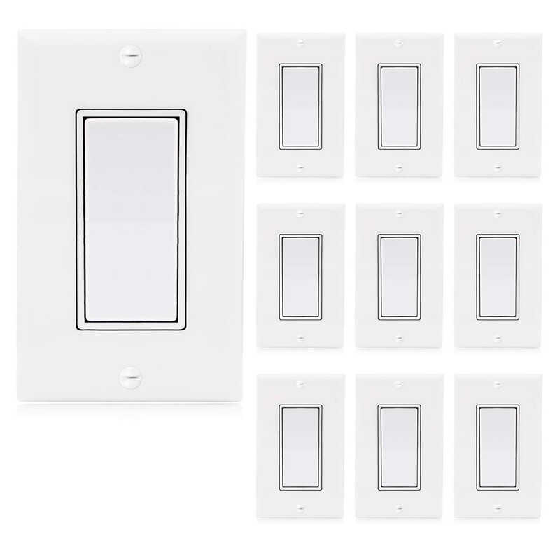 - Matching wall plates are included as well as all hardware and an instruction manual for easy installation. They come in a pack of 10 to ensure the switches throughout your home match.
