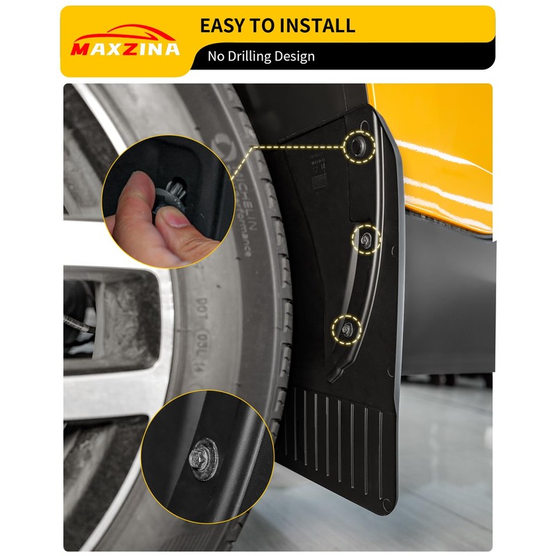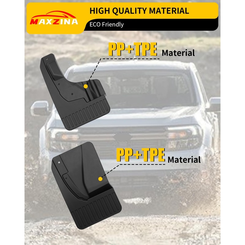 - Material: A pair of 4 pieces, made of high-quality black ABS, firm and not easy to fall. The mud flaps seamlessly integrate with the vehicle, avoiding contact with painted areas to maintain the truck's pristine appearance.