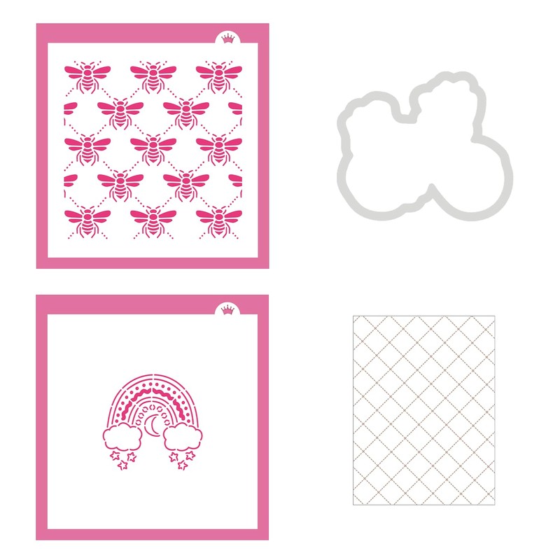 May 2024 Subscription Box - Spring into Nature. May 2024 Subscription Box - Spring into Nature includes: Boho Rainbow Stencil, Bees Lattice Stencil, Bicycle with Flowers Cookie Cutter, and Crisscross Cookie Backer Cards - Pack of 25. Boho Rainbow Stencil. Design size is 2.65" x 2.55". This beautiful stencil is a great addition to your PYO assortment. Bees Lattice Stencil. Design size is 4.75" x 4.75". Nothing says spring like bees, and this lattice background is perfect for seasonal sets, baby showers, and more! Bicycle with Flowers Cookie Cutter. Fill the baskets on this bicycle cutter with flowers, books, puppies - whatever you can imagine! Crisscross Cookie Backer Cards - Pack of 25. These grease-proof backers are now available in a sweet dotted lattice print. Perfect for complementing your cookies and letting them shine!