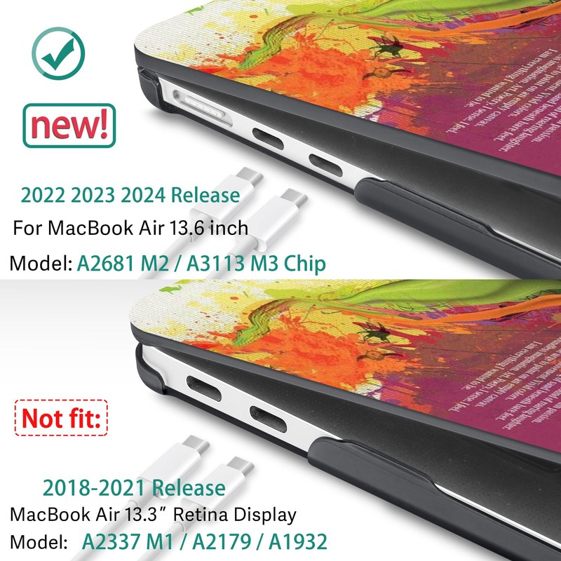 - Designed ONLY to be compatible with MacBook Air 13.6 inch 2022 2023 2024 Newest Release Model: A2681 A3113 M2 M3 Chip with Liquid Retina display Fits Touch ID. Pls verify Model No. the underside of notebook before buying.