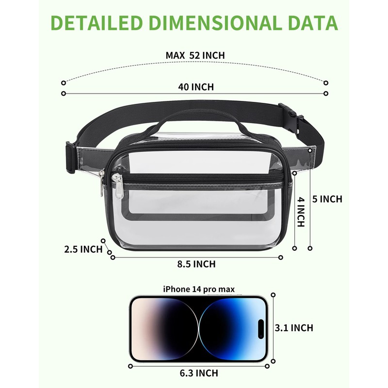 - 【Easy Storing】The clear fanny pack has a 4*8.5 front pocket to put cards, pens and other small items. The main pocket can put down your phone, rechargeable battery and wireless headphones.