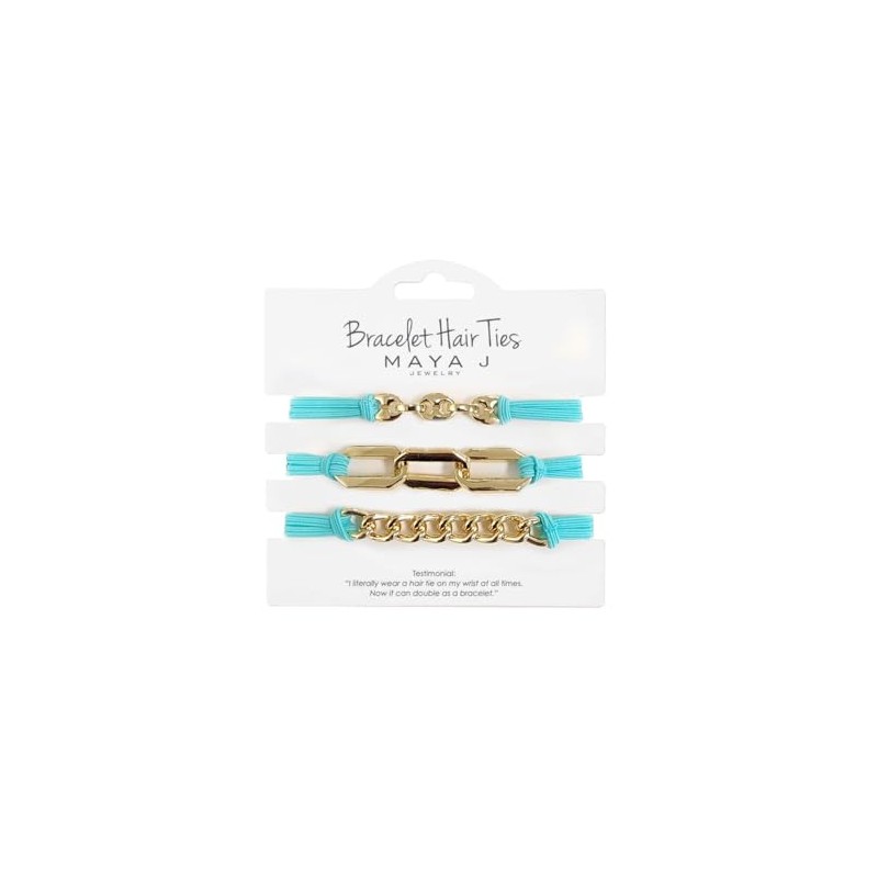 - Vibrant teal hair ties featuring a yellow mariner chain.