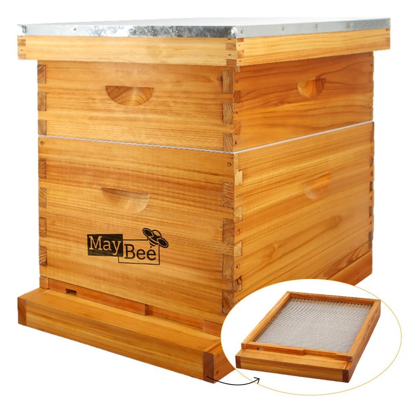 MayBee 10 Frame Screened Bottom Board Beehive Dipped in 100% Beeswax, Bee Hives Kit Includes 1 Deep Boxes & 1 Medium Box with Beehive Frames and Wax Foundations. Preferred for Summer