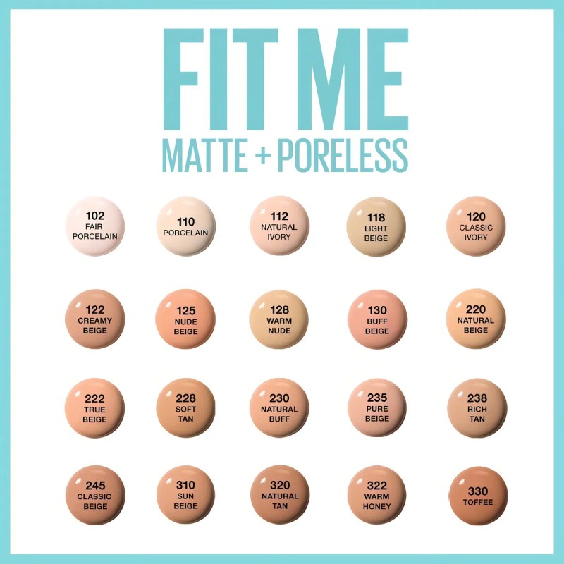 Maybelline Base Maquillaje Líquida Fit Me Matte,12 gr, matifica, control brillo 16h, minimiza poros