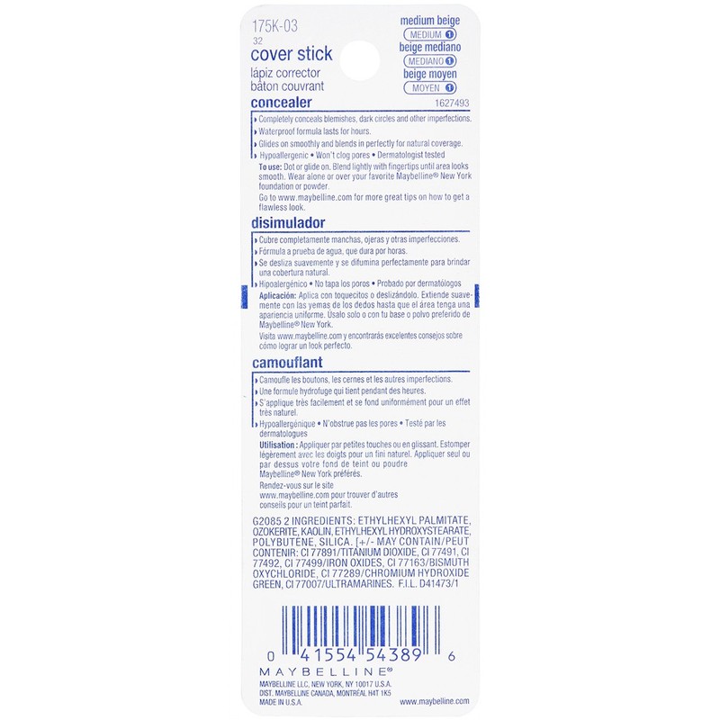 Maybelline New York Cover Stick Concealer, Medium Beige, Medium 1, 0.16 Ounce