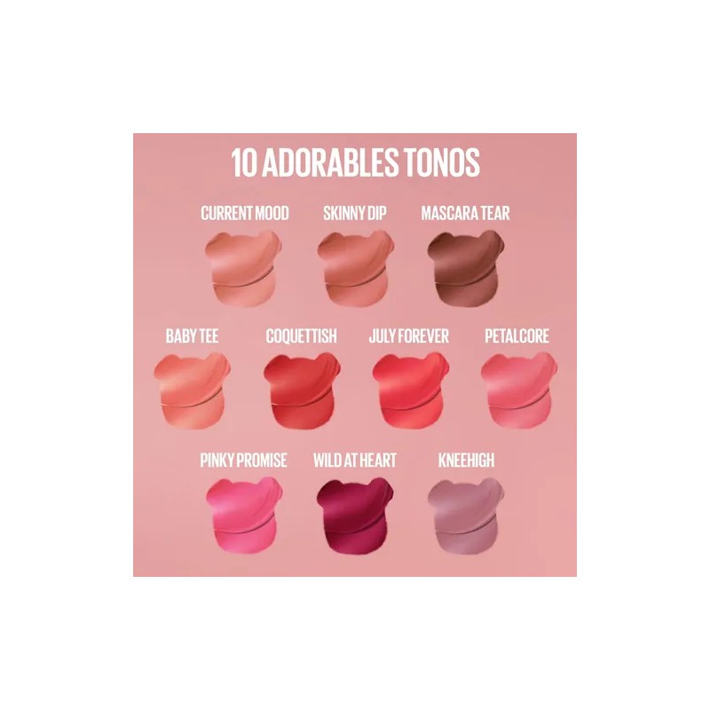 • Su nueva fórmula Teddy Fluff te hará lucir unos labios mates con acabado suave hasta por 12 horas.