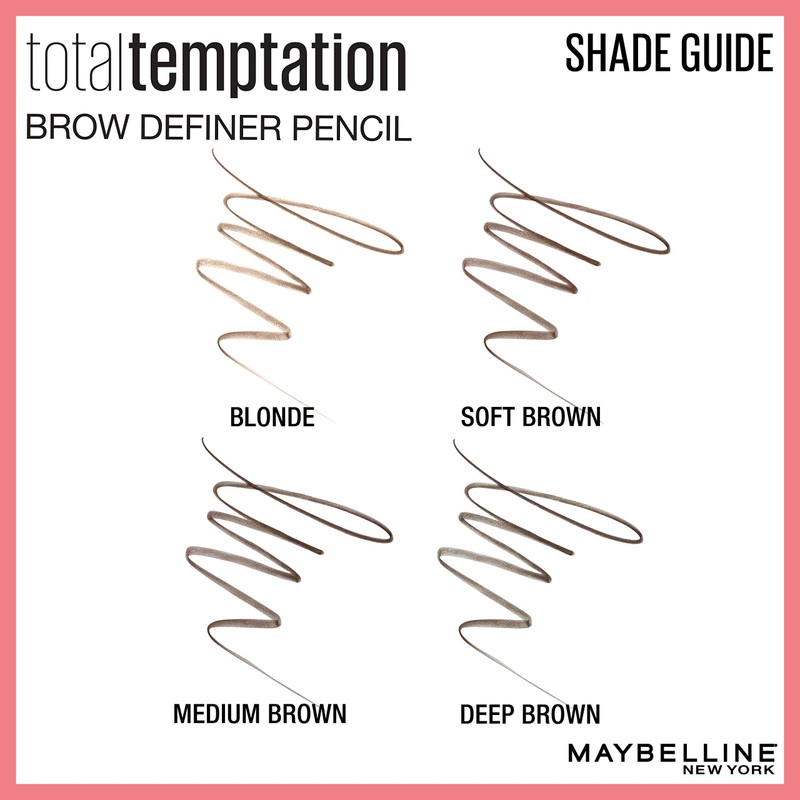 • Total Temptation Maybelline Eyebrow Pencil: Fill in eyebrows with this must have defining eyebrow pencil, featuring a teardrop tip; Shape with pencil and blend with the eyebrow spoolie brush, for a softly defined natural-looking brow