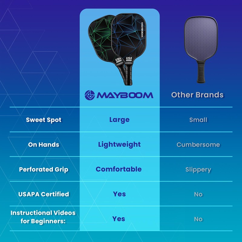 - USAPA Approved Pickleball Paddle: Mayboom pickleball paddles are tested and approved by the USAPA for high safety and professionalism in tournament pickleball play in the US and international events. Mayboom pickle ball set use a lightweight honeycomb core with a fiberglass face, paired with advanced technology for balanced control and powerful shots, enhancing your playing experience in the game of Pickleball