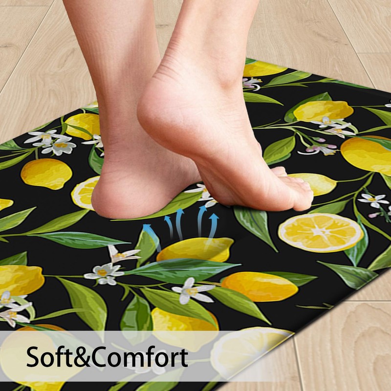 MAYHMYO Cushioned Anti Fatigue Kitchen Rug Sets 2 Piece Non Slip Kitchen Mats for Floor,Black Lemon Waterproof Ergonomic Comfort Foam Rugs for Home,Kitchen,Office,Sink,Laundry