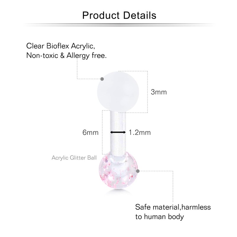 Mayhoop 16G Clear Tragus Helix Earrings Studs Piercing 6mm Flexible Acrylic with Glitter BallTragus Helix Piercing Lip Bars Retainers for Women Men 6Pcs