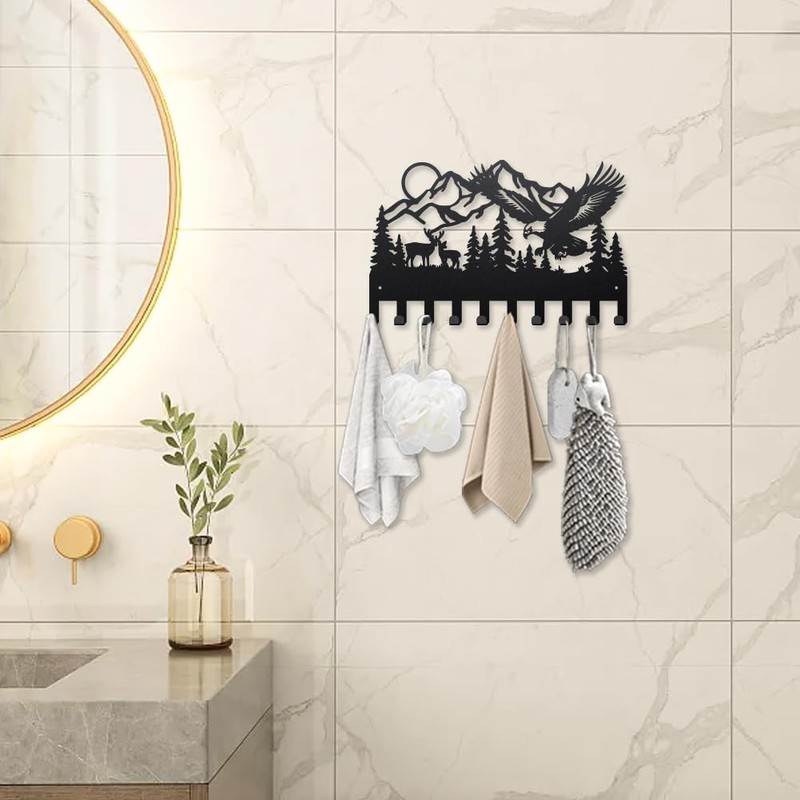 MAYJOYDIY Mountain Forest Animal Metal Coat Racks Wall Mounted Deer Bird Coat Hooks 15.7×9.8inch 10 Hooks Nature Scenery Key Holder Wall Art Decor Gift Black Key Hooks for Coats Hats Towels Bags