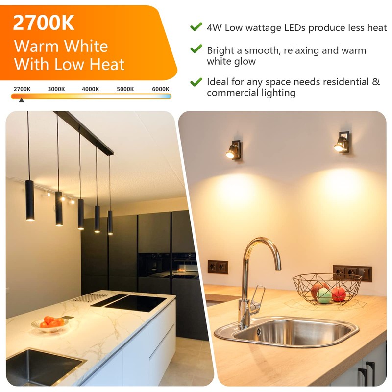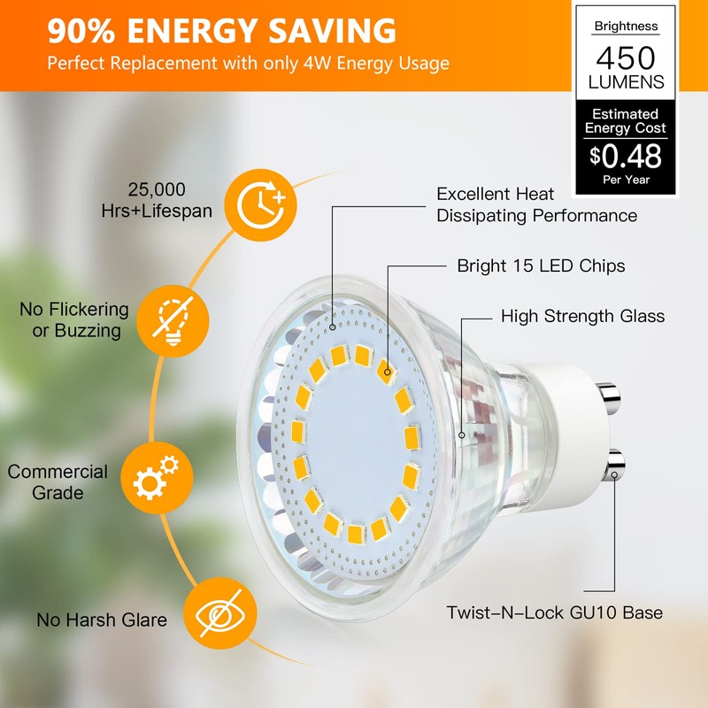 • Energy Efficiency & Money Saving: Designed with energy-efficient LED chips, 4W GU10 LED bulbs offers you the perfect replacement for traditional 50W halogen bulbs. Based on 3 hours of use per day, the GU10 led bulbs warm white will reduce heat output and save up to 90% on the electric bills of lighting. Note: These LED lights are not dimmable.