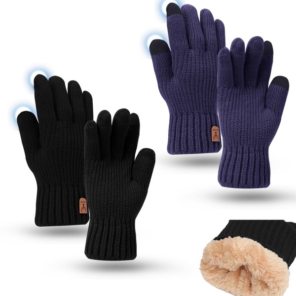 Mayoii 2PCS Winter Gloves for Men and Women,Thermal Knit Touchscreen Gloves with Fleece Lining,Womens Mens Glove Touchscreen for Running,Ski,and Cold Weather (Black+Navy, One Size)