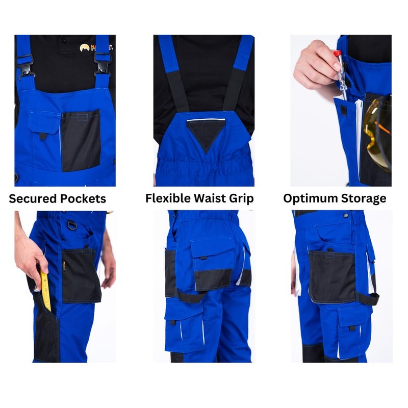 - Beautiful work trousers dungarees with many pockets; double ruler pocket and patch mobile phone pocket, knee reinforcement with knee pad pockets