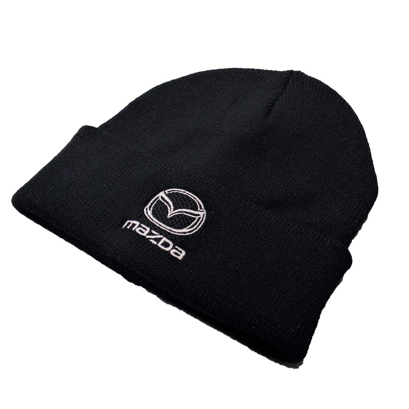 - Strong black Mazda beanie with roll up cuff. Mazda logo embroidered on the center front.