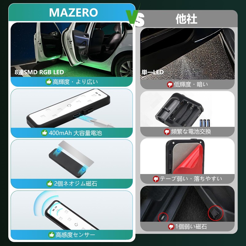 MAZERO No Wiring Car Curtain Lamp, Door Opening/Closing Warning Light, LED Welcome Light, Magnet, Infrared Sensor, Car Door Impact Prevention, Universal Use, Door Warning Light, USB-C Rechargeable, 7