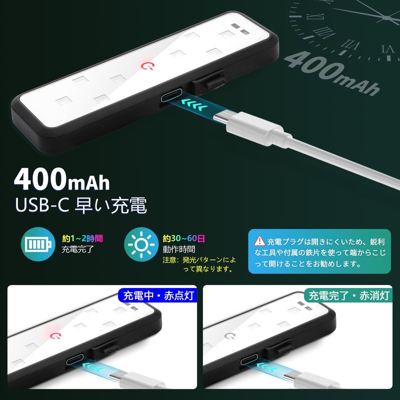 - (USB-C charging and improved convenience) The charging plug is difficult to open, so please pry it from the edge with the tools or included iron plate. Built-in 400mAh battery and Type-C charging terminal, charging speed is faster and more convenient than traditional Android devices. With dust cover on the port, charging time is about 90 minutes. Red light on while charging, red off when charging is complete. The compact courtesy light can be used for about 30-60 days on a full charge. (depending on the light pattern and frequency of use)