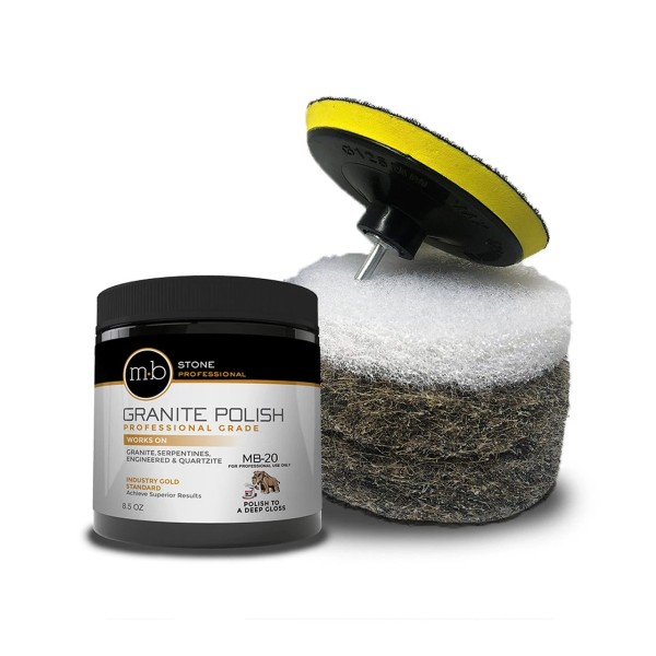 MB-20 Granite Polish is an exclusive proprietary blend of abrasives and polishing agents that represent an industry first and a definite breakthrough to polish your granite, mercantile granite, and serpentine. When used correctly, the polishing agent may leave your granite looking as much as 20% to 30% better than its original factory finish. The Granite Polishing Kit is an easy-to-use kit developed exclusively for homeowners. No expensive tools to buy. This kit includes a drill attachment that is designed to work on a regular variable speed household drill. The following directions are an average recommendation. Different stones may require different quantities of the product along with various techniques. For darker stones, we recommend adding a tint to the product.