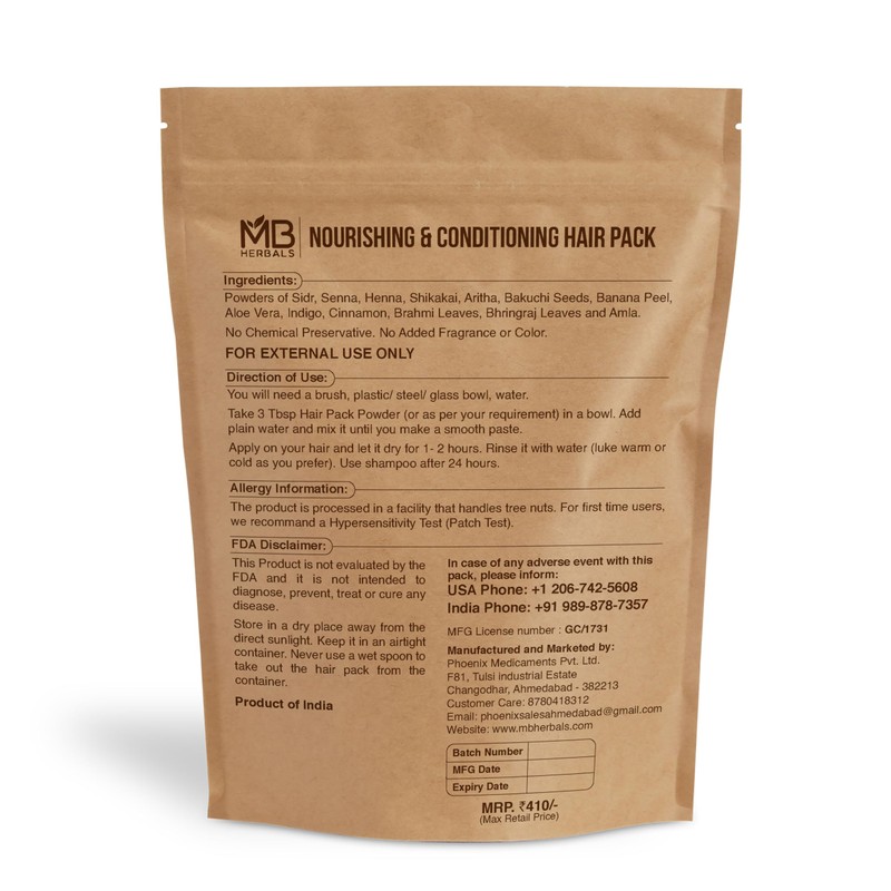 - MB Herbals Nourishing & Conditioning Hair Pack is made from 100% Pure and Natural Ingredients. It contains Amla Cinnamon Aloe Vera Sidr Senna Bakuchi Aritha Shikakai Bhringraj Brahmi Indigo and Banana Peel Powders.