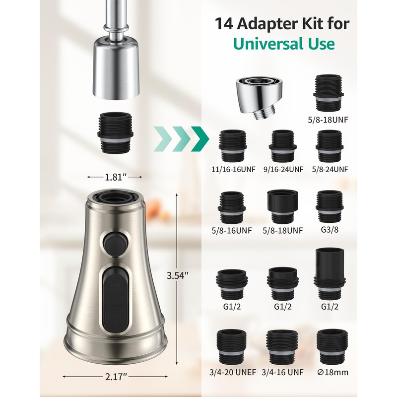 - Universal with 14 Adapters: MBILLION Brushed Nickel Kitchen Sink Faucet Head Attachment comes with 14 adapters compatible with most types of faucets from American Standard Faucets, compatible with Kohler, Hansgrohe, Grohe, Moen, Delta,wewe and more.
