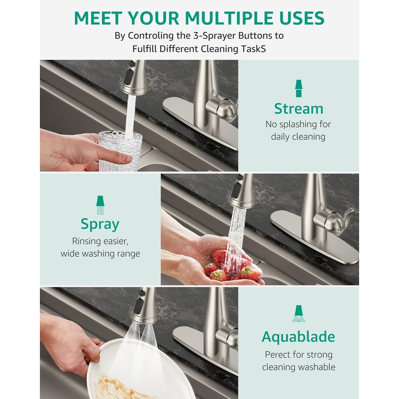 - Switching Between 3 modes: MBILLION High Pressure Pull Down Kitchen Faucet Head Brushed Nickel has 3 modes: stream, spray,blade spray modes; The blade spray mode has very strong power to easily flush food residue; Just easily press different buttons, and there are different modes to meet your cleaning needs.