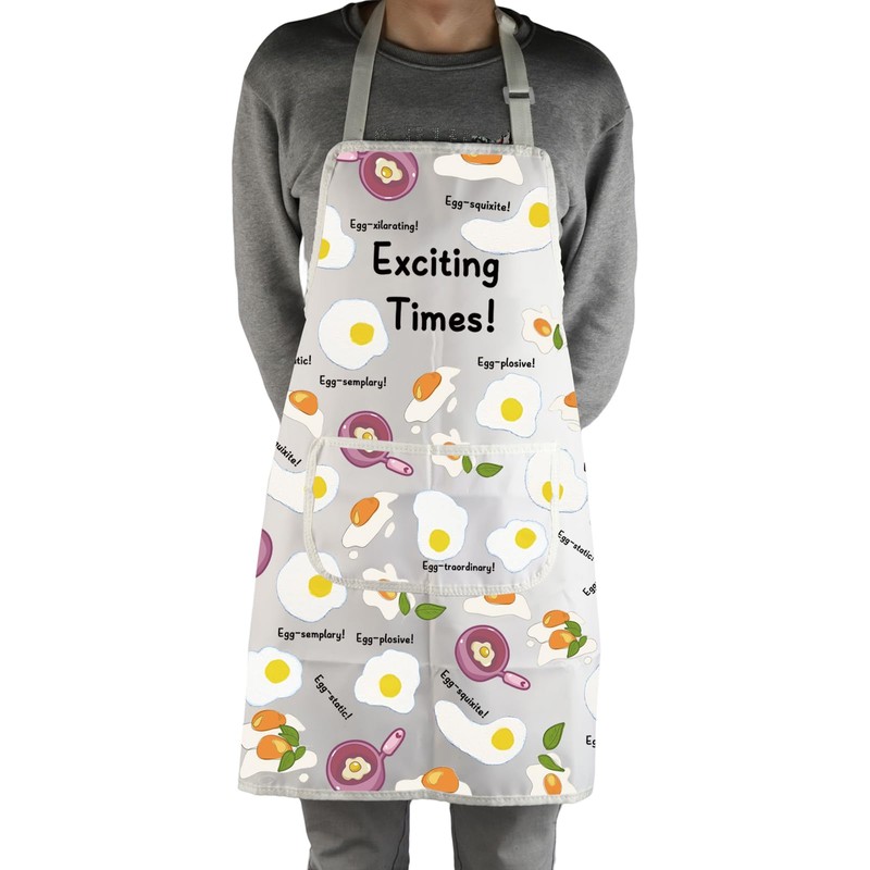 - [QUALITY MATERIAL]: Fried Egg Apron is made of 290 waterproof composite fabric, it has a unique design, with the long waist ties and an adjustable neck strap for comfortable wearing. Kitchen adjustable aprons provides superior protection from water, oil and dirty, kitchen grease, spills and food stains. Non-absorbent and washable. No harmful substances, safe for you and your family.