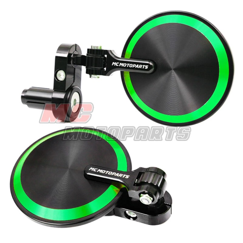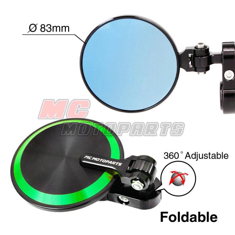 100% Brand New High quality 6061 CNC machined aluminum Swivel head & Foldable design, easy to adjust Blue Tinted glass mirrors New Spiral Texture on the back surface Light Weight Easy installation. Can only insert into handlebar for installation. no modification is requiGreen Fit motorcycles with 7/8" OD bars or clip-ons with 13mm-17mm inner diameter ID hollow handlebar Color: Green QTY : 1 pair (Left & Right) Fitment: Kawasaki ZX12R 2000-2006