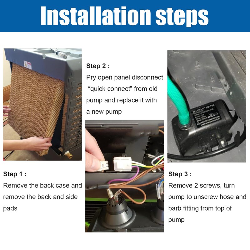 - EASY INSTALLATION - ①. Remove the back case and remove the back and side pads; ②. Pry open panel disconnect “quick connect” from old pump and replace it with a new pump; ③. Remove 2 screws, turn pump to unscrew hose and barb fitting from top of pump
