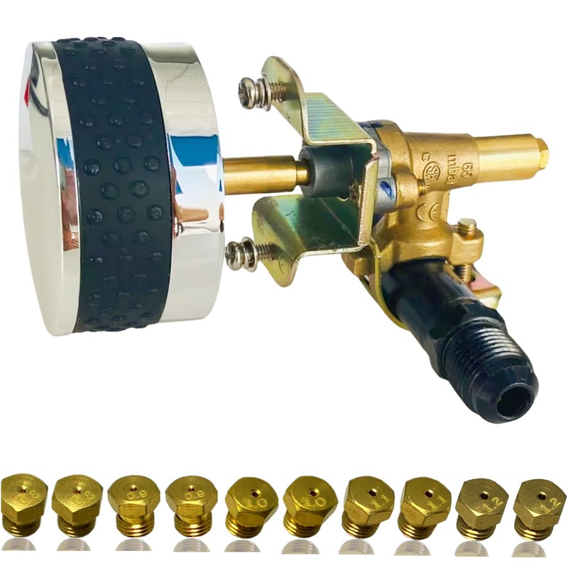- 1/2 PSI 65mbar gas control valve (5/8”-18 UNF male gas flare inlet connector) with different gas burner nozzles orifice size and grill control knob