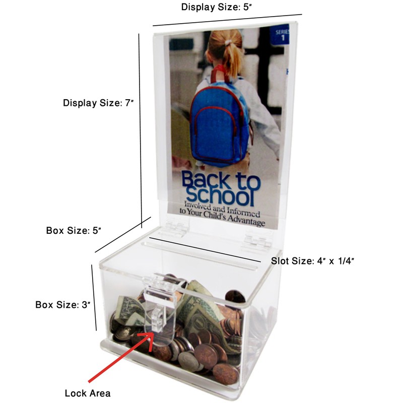 - Features a slot for lock to keep your donations safe. This display donation box has worked great for many major and non-profit organizations in raising funds Acrylic collection box with padlock.