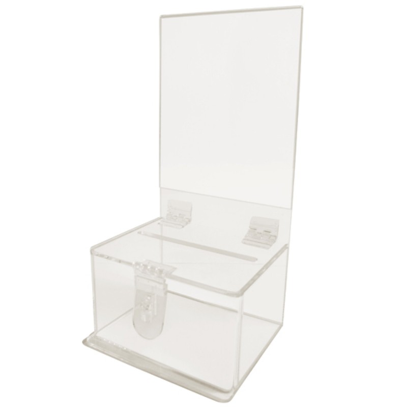 - Our clear acrylic small donation box is made of sturdy, clear acrylic. This acrylic donation box has a fundraising display for your organization's message and works great as a donation box, ballot box, coin canister, or suggestion box.