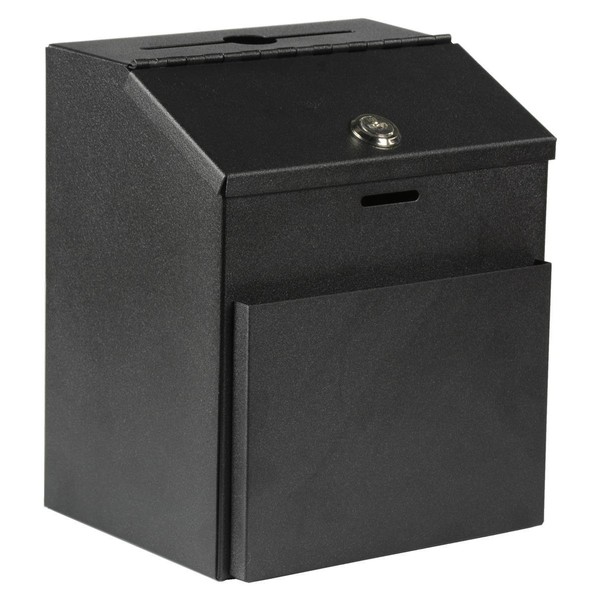 - Black metal suggestion box keeps entries anonymous.
