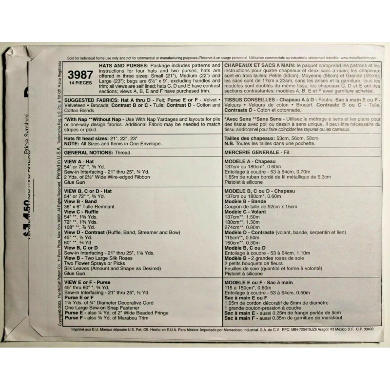 McCall's 3987 Misses 2 Purses & 4 Hats Sizes: S-21" M-22" L-23" Sewing Pattern