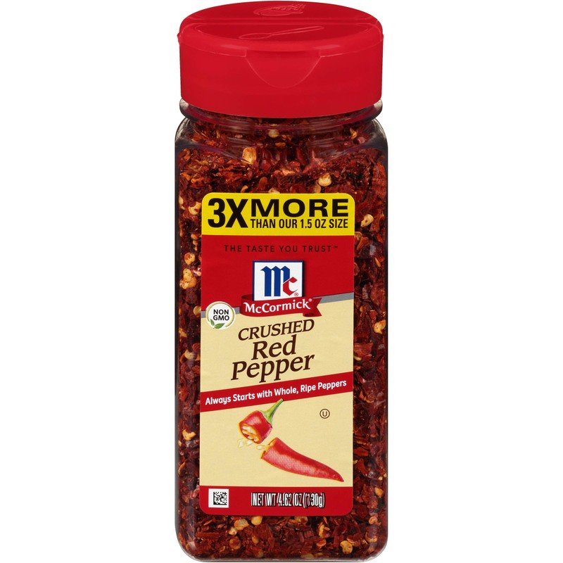 A pinch of McCormick Crushed Red Pepper adds fiery fresh heat and a zesty flavor boost to any dish. It’s the perfect companion to pizza, eggs, pasta sauce, tacos, stews, casseroles, soups and so much more. McCormick Crushed Red Pepper always starts with whole, ripe peppers. We blend the optimal levels of seeds and pods to deliver bold flavor and balanced heat. Pure crushed red pepper has a vibrant, red color from the flakes and is lightly flecked with yellow seeds. It has a slightly fruity, chili pepper aroma with a consistently spicy heat. Add just a pinch to kick up the flavor of your favorite foods. Or use to add heat to so many world cuisines, from Thai and Szechuan to Indian and Ethiopian.