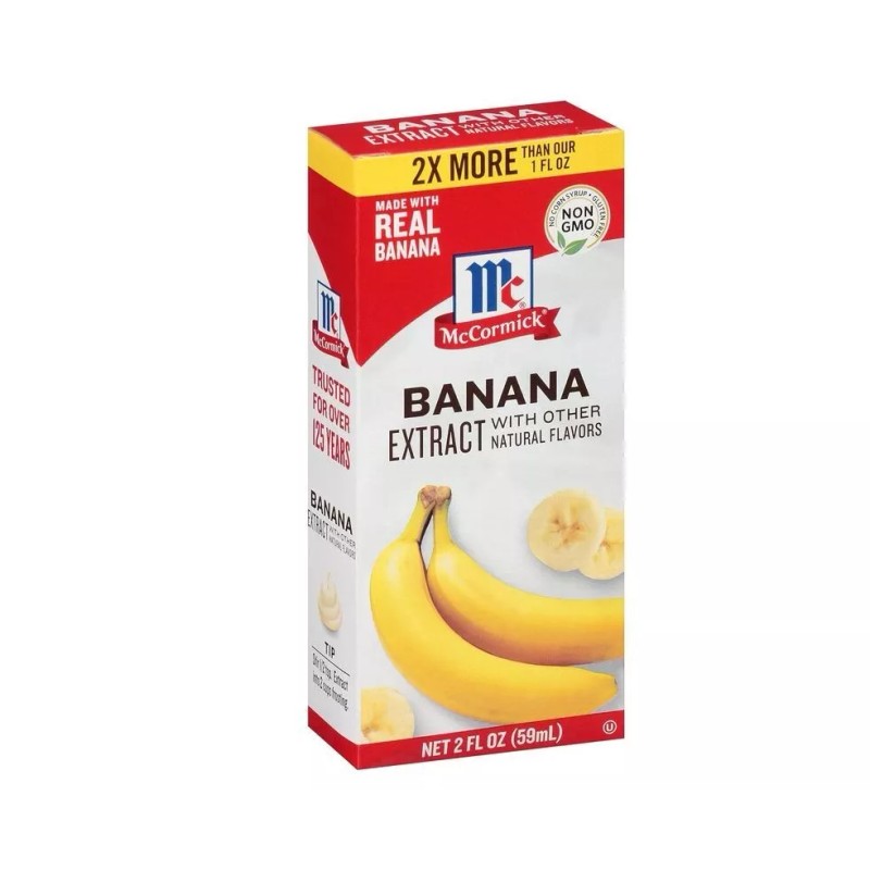 - McCormick Gluten Free, Non GMO Banana Extract, Infuse real, fruity banana taste into everything from homemade muffins to cakes and cookies. McCormick Banana Extract is made with real banana, for corn syrup. It's also Non GMO and gluten-free. Here at McCormick, we're always working to craft the best flavors for you and your family. Banana Extract will not add color to your recipes. Tip: Try using a dash of food coloring to achieve desired hues. This McCormick Banana Extract With Other Natural Flavors is in a box that is 1 fluid ounces.