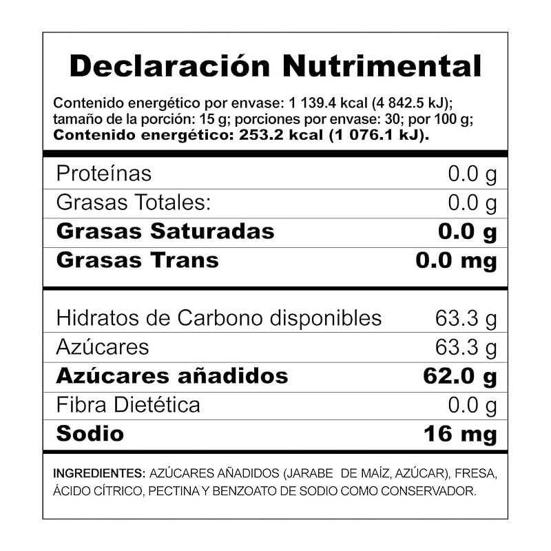 | Ingredientes | Fresa, azúcares, ácido cítrico, pectina y .1% de benzonato de sodio como conservador. |