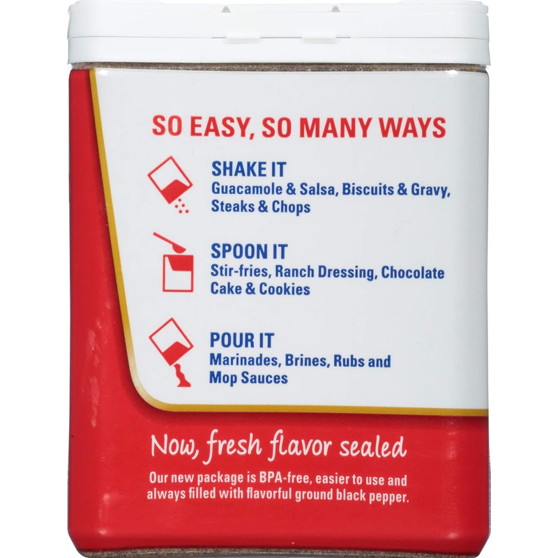 You can’t go wrong with McCormick Pure Ground Black Pepper. This pantry staple adds bold flavor to any culinary creation. Features an intense woody-piney flavor and consistent granulation that is hot and biting to the taste. Shake McCormick Pure Ground Black Pepper on tossed salads or steamed veggies for a tasty kick. Or sprinkle this essential spice on roasted meats and use it in marinades to develop deep, zesty flavor. It’s also great for biscuits, crackers, spice cookies and other baked goods. In fact, you can use black pepper on almost any dish to delight pepper lovers everywhere.