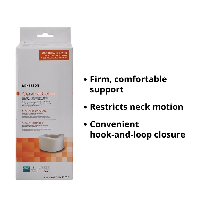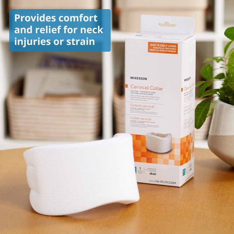 McKesson's one-piece cervical collar helps provide firm, comfortable support for the relief of muscle, tendon, ligament, or soft issue injuries of the neck. It features a soft, porous, off-white stockinette made of 100% polyester rib fabric with a polyfoam collar for comfort. The recovery aid restricts neck motion, helping to relieve discomfort or strain. It features 7/8 inch thick polyurethane foam construction for effective support. A convenient hook-and-loop closure system allows the unit to be uniquely adjusted for a proper fit. The reusable design can be cleaned by handwashing in cold soapy water and letting air dry. One size fits most adults. The circumference of the cervical collar is 19 to 22 inches. It measures 22 inches long and 3 3/4 inches high.