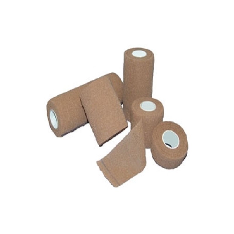 This elastic bandage contains a cohesive material which allows the bandage to stick to itself but not to other materials or skin.