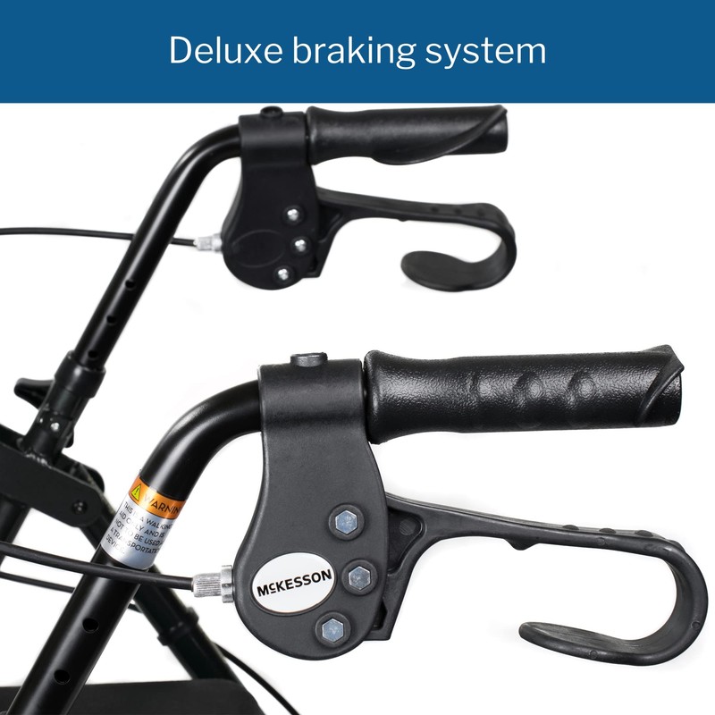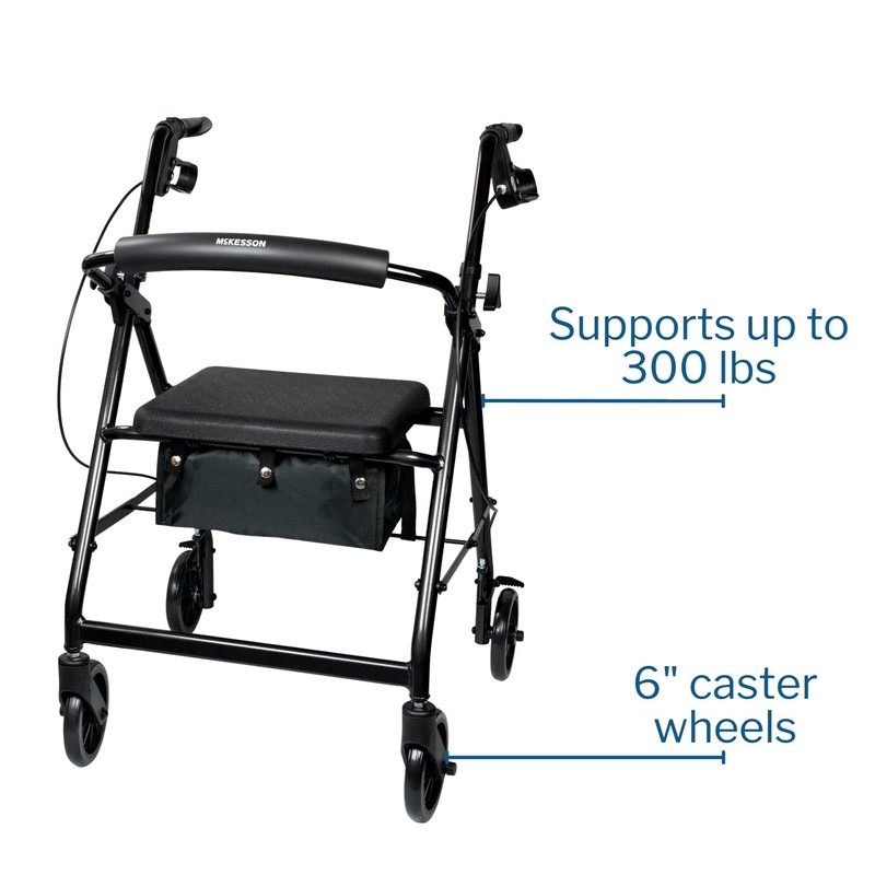 McKesson Rollator Walker with Seat and Wheels, Lightweight, Aluminum, 300 lbs Weight Capacity, Black, 1 Count
