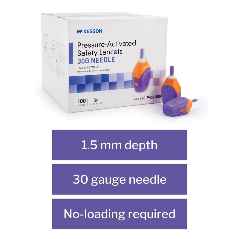 McKesson Safety Lancets, Sterile, Pressure-Activated, 30 Gauge Needle, 1.5 mm, 100 Count, 1 Pack