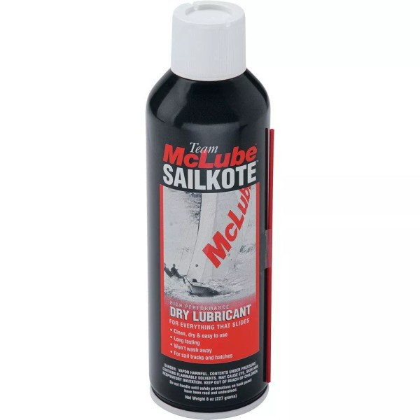 Mclube Sailkote (8oz.) Mclube 8 Oz Aerosol Spray Can. Dry Lubricant Used On Sails, Rigging, Blocks & Hull. Apply With Rag & Gloves. Sailkote is the easy to apply high-tech, high performance dry lubricant that makes sails, hulls, rigging, deck hardware, and anything that moves on your boat run smoother, work more efficiently and last longer than you ever thought possible. Team McLube Sailkote is the only dry lubricant currently available that has been specifically designed for marine use. Sailkote is a translucent liquid that sprays or wipes on and completely dries in seconds. So, unlike oils, silicones, and waxes, it will never attract dirt, water and contaminants that eventually degrade lubrication performance. “World class” sailors across the globe from maxi-racers to sailboarders are enjoying the benefits of Sailkote's advanced dry lubrication technology. The same dry lubricant technology that has been developed for, and race proven by America's Cup Teams, Olympics Medalists, and One Design World Champions. Discover the difference Sailkote can make in your sailing performance and enjoyment. Examine the cruising and racing applications pages for complete application information and important performance enhancement tips. Just as the sailors of nearly every America's Cup syndicate have discovered, no boat should be sailing without the benefit of Sailkote. It dries quickly to a hard, smooth, ultra-slick, hydrophobic dry coating that bonds tenaciously to almost any surface. And because Sailkote is a dry lubricant, it will not attract dirt or contaminants and will not transfer to other surfaces, or you. Sailkote is typically five times as effective, and lasts much longer than, wax, oil or Teflon based lubricants.