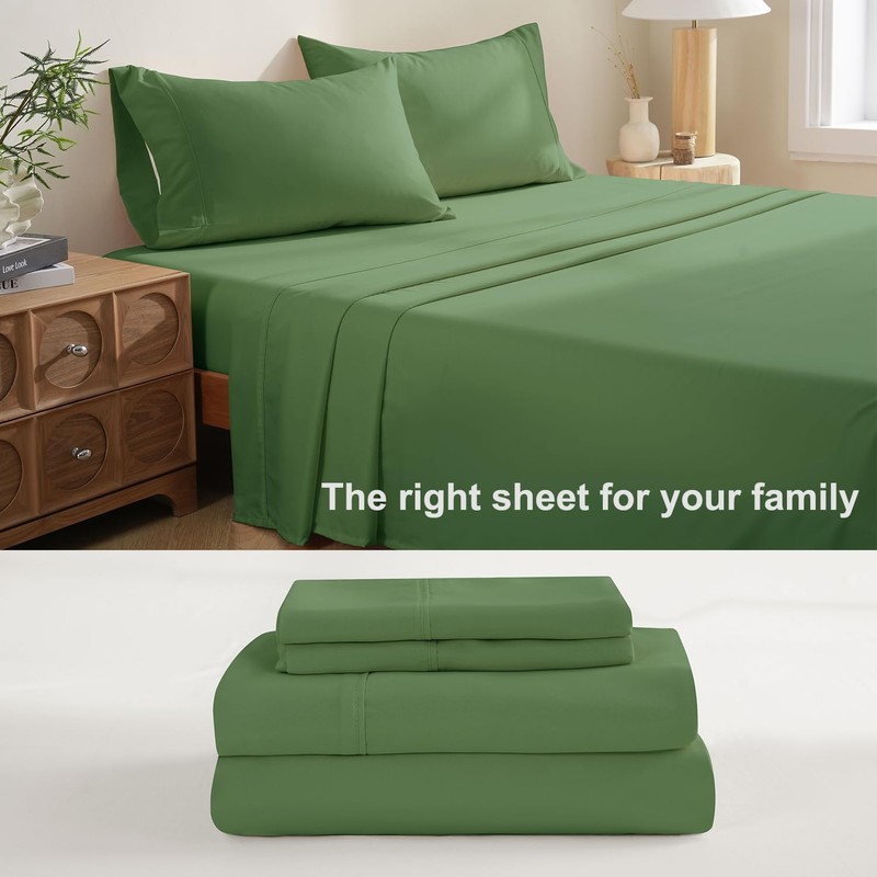 - COMPLETE BEDDING SET - Fits your lovely bed with our twin sheet set. The 3-piece set includes 1 x flat sheet (66"x96"), 1 x fitted sheet (39"x75") and 1 matching pillowcases (20"x30"). The dark moss green color adds an elegant touch to your room.