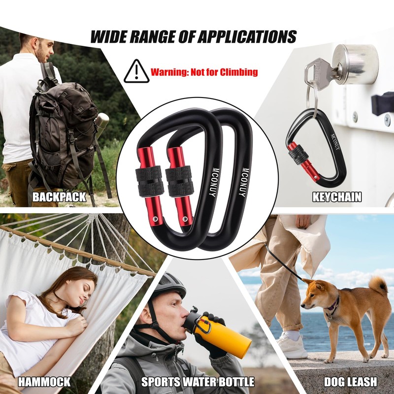 - MCONUY small locking carabiner clips, with D-shaped design, are suitable for camping, hiking, hammocks, swings, dog leashes, or use as a key ring.