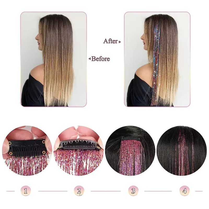 - Easy to Use: The glitter hair tinsel extensions are 50cm, long enough to be cut into different lengths according to your hair extension requirements. Just open and close the tension clip, holds sparkle strands securely in your hair.