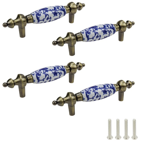 Mcredy Ceramic Pull Handle Cabinet Drawer Pulls Blue and White Porcelain Pattern with Screws t Bar Pull Handle Pack of 4